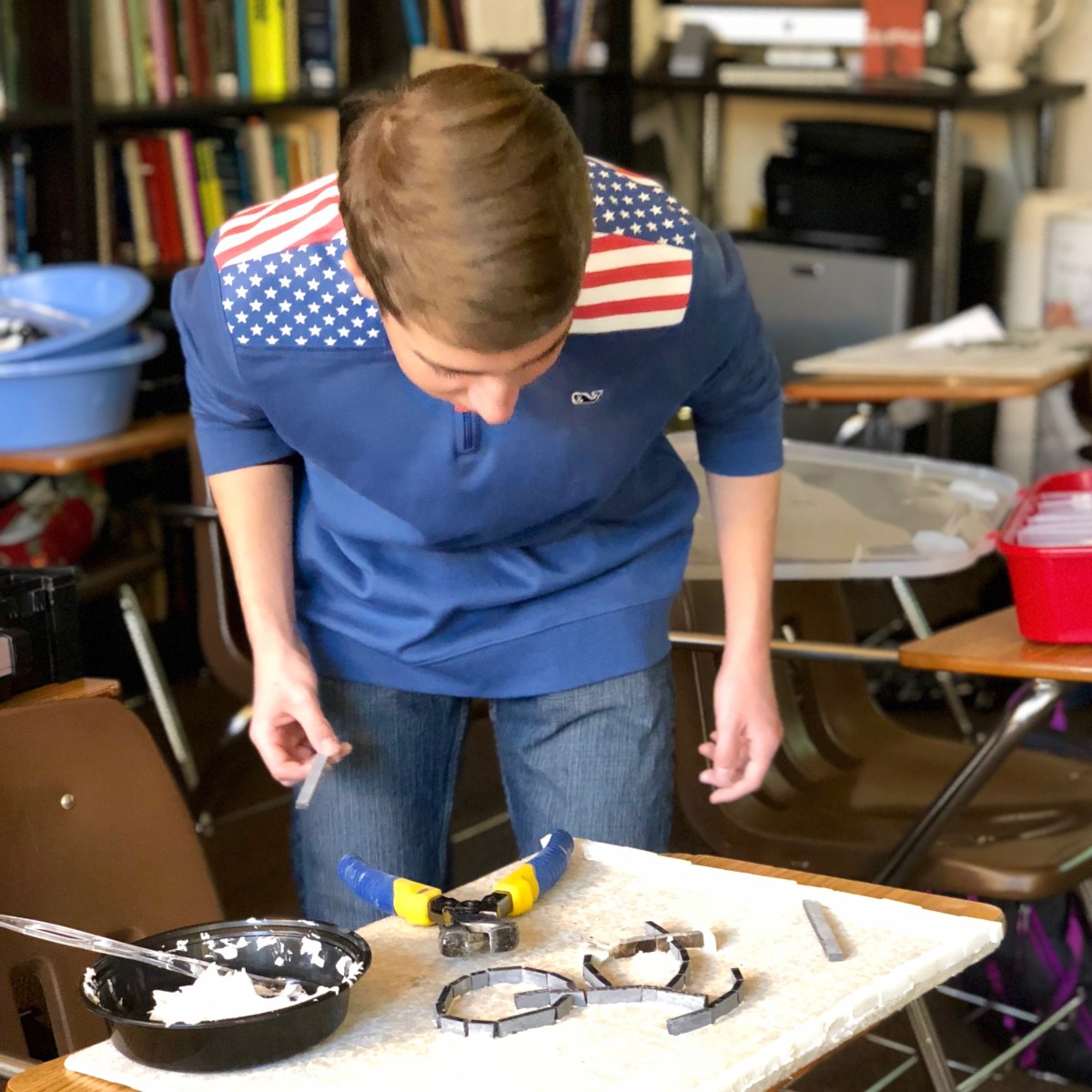 IMG-0987 Published January 24, 2018 at 2676 × 2676 in Piece by Piece Winterim ← Previous Next → Robert Jones uses tile nippers to cut his tile into squares